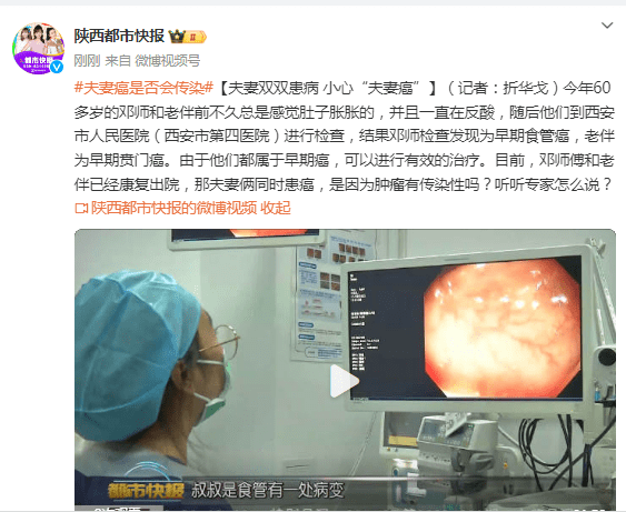 (记者:折华戈)今年60多岁的邓师和老伴前不久总是感觉肚子胀胀的,并且一直在反酸,随后他们到西安市人民医院(西安市第四医院)进行检查,结果邓师检查发现为早期食管癌,老伴为早期贲门癌。由于他们都属于早期癌,可以进行有效的治疗。目前,邓师傅和老伴已经康复出院,那夫妻俩同时患癌,是因为肿瘤有传染性吗?听听专家怎么说?