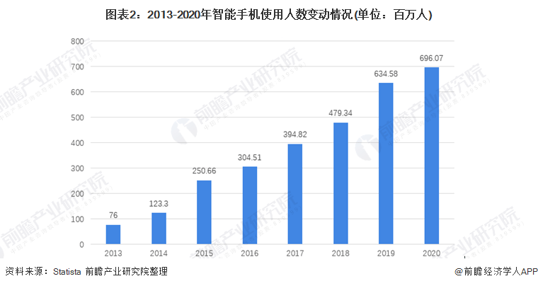 根据统计数据显示,从2013年到2020年,印度智能手机使用人数规模呈现逐年上升的趋势。在这段时间内,年复合增长率达到37.22%。截至2020年,印度智能手机使用人数规模已达到6.96亿人,同比增长率为9.69%。