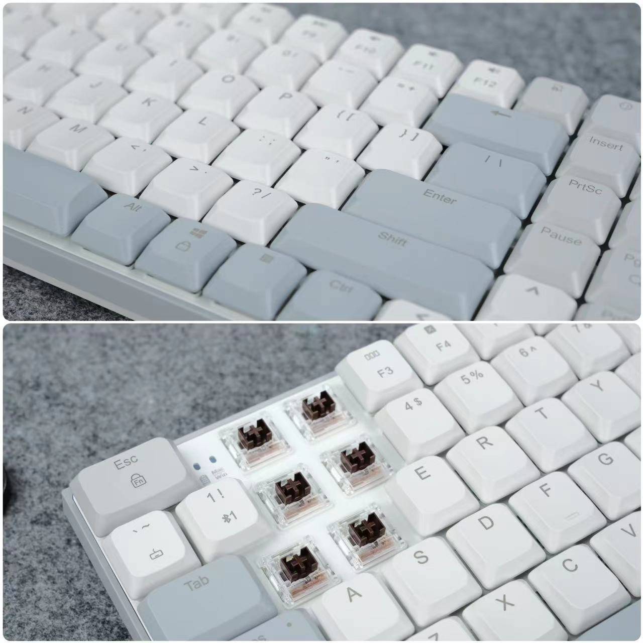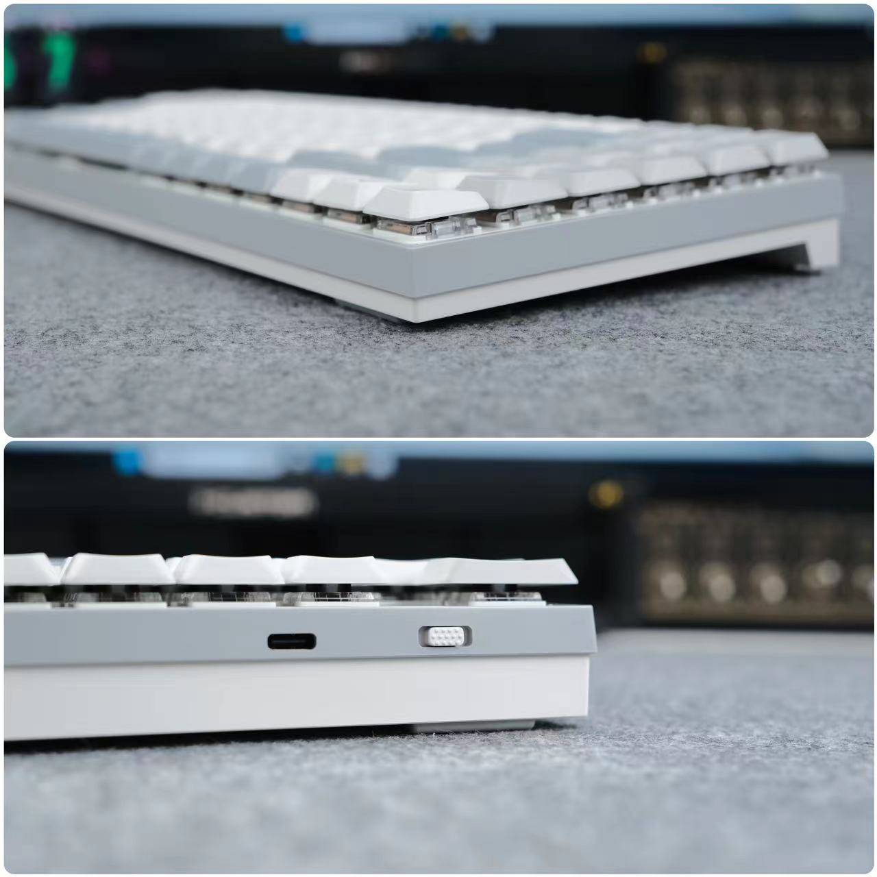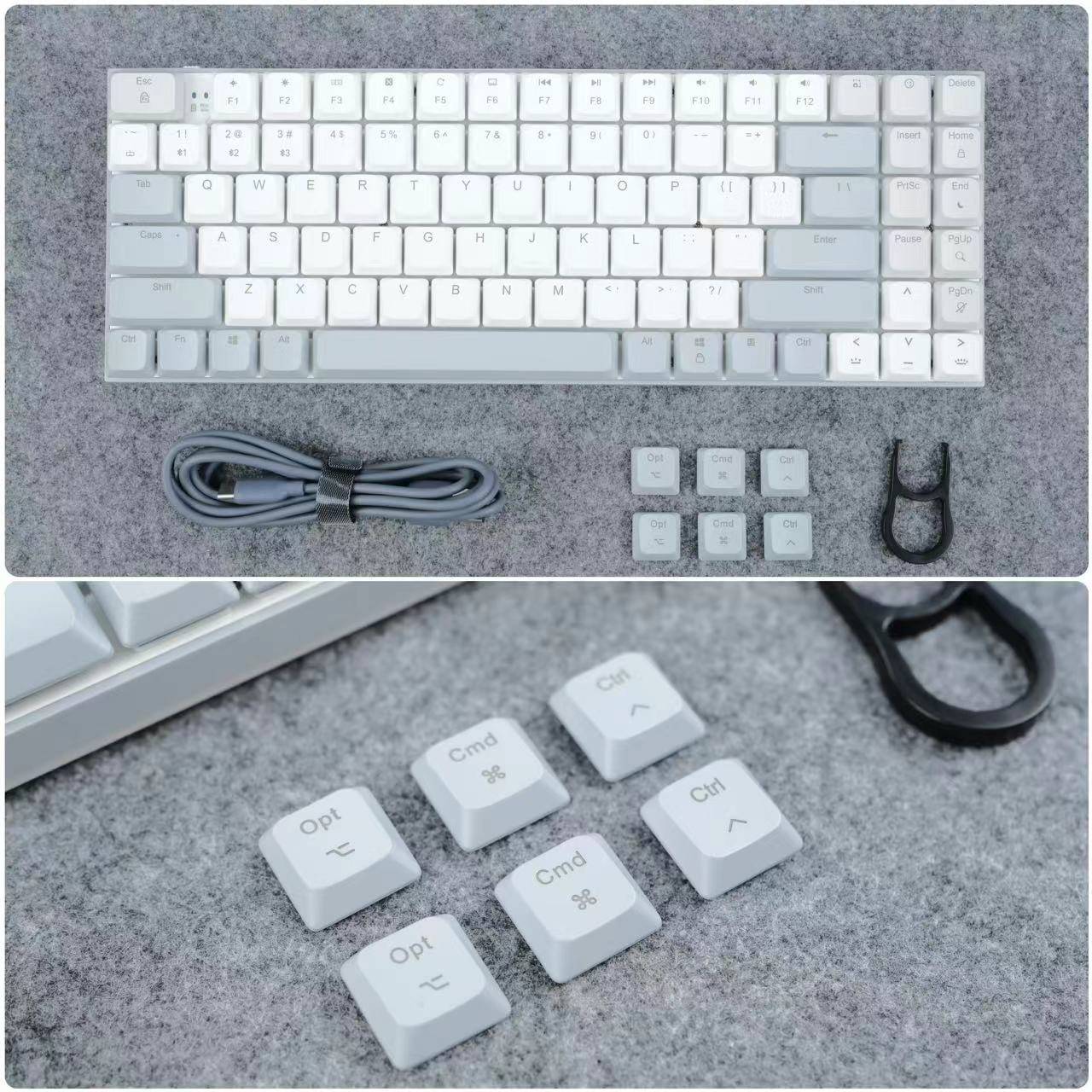 🔺包装内配置也比较简单,除了主体的键盘外,还有一条充电线和6个MacOS替换的键帽和拔键器,这也正说明这款键盘一定是支持多系统使用的。键盘颜值还是很棒的,白灰灰蓝三色键帽,让这把键盘透露出一丝素雅非常适合低调有内涵的你使用。