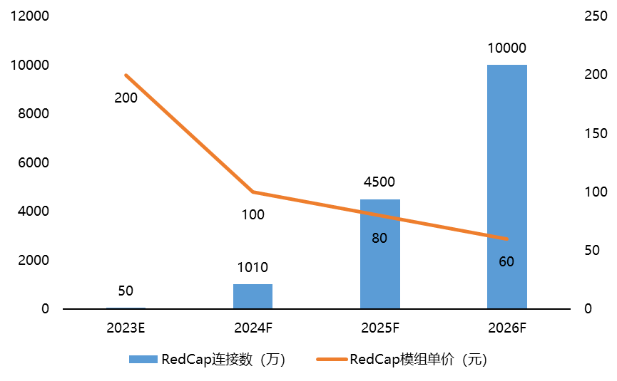 综合Cat.1的发展历史、RedCap试商用现状以及RedCap在未来短中长期的发展趋势,我们预计,RedCap将于2024年迎来爆发式增长,实现连接数超千万,最早有望于2026年即实现连接数过亿;模组单价将伴随连接数爆发而快速走低,2026年底前有望低至60元/片。