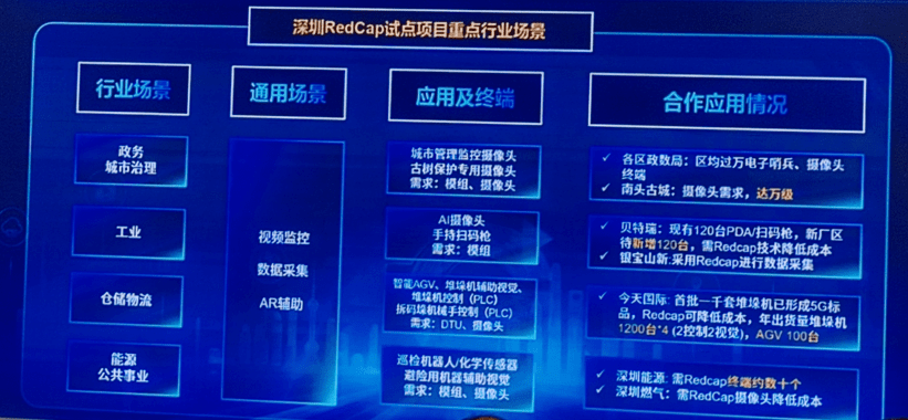 同时,中国电信选取深圳将其作为打造“RedCap之城”的商用标杆,力求实现在应用规模、商用场景、网络覆盖、连接数等方面的全方位领先。目前,中国电信深圳“RedCap之城”已选取了政务城市治理、工业、仓储物流、能源公共事业等四大行业,针对视频监控、数据采集、AR辅助等三大通用场景,开展应用及终端试商用。相关应用合作进展良好,获得了宝贵的试商用市场数据和推广普及决策参考。