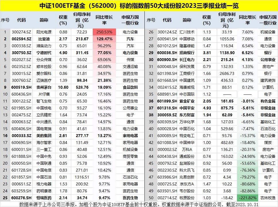 根据中证指数公司数据,中证100指数前50大权重股仓位占比达78.54%。从前50大成份股整体业绩表现来看,按整体法统计,除中芯国际外的49家龙头公司前三季归属母公司净利润合计达12869.95亿元,同比增长5.2%。