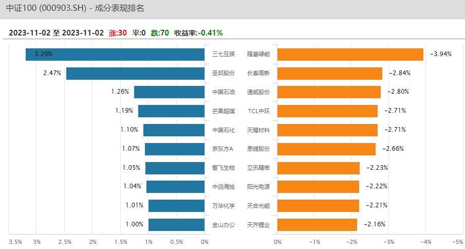 今日A股回调,两市超4200只个股收跌。A股核心资产盘初冲高回落,午后震荡走低,反映核心资产整体表现的中证100指数盘初一度涨至0.85%,午后翻绿,收跌0.41%。 成份股方面,三七互娱、圣邦股份各涨3.2%、2.47%居前,中国石油、中国石化等“中字头”涨逾1%;新能源相关龙头股领跌,隆基绿能跌近4%,通威股份、天赐材料、恩捷股份跌逾2%。