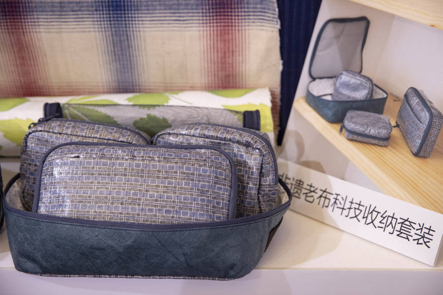 据介绍,两者结合形成了两种新的复合结构材料。一种是经过材料表面淋膜处理,使“科技土布”的正面和反面都具有防水、透气功能,在日常使用中可以防霉防潮,而且耐污。这种“科技土布”消除了土布不防水、材料本体重的弱点,轻型又环保,而且带有各种土布纹饰。另一种复合结构材料称为“设计师款”,其表面不做淋膜处理,正面保留了土布质感,背面具有防水、防霉、透气等功能。