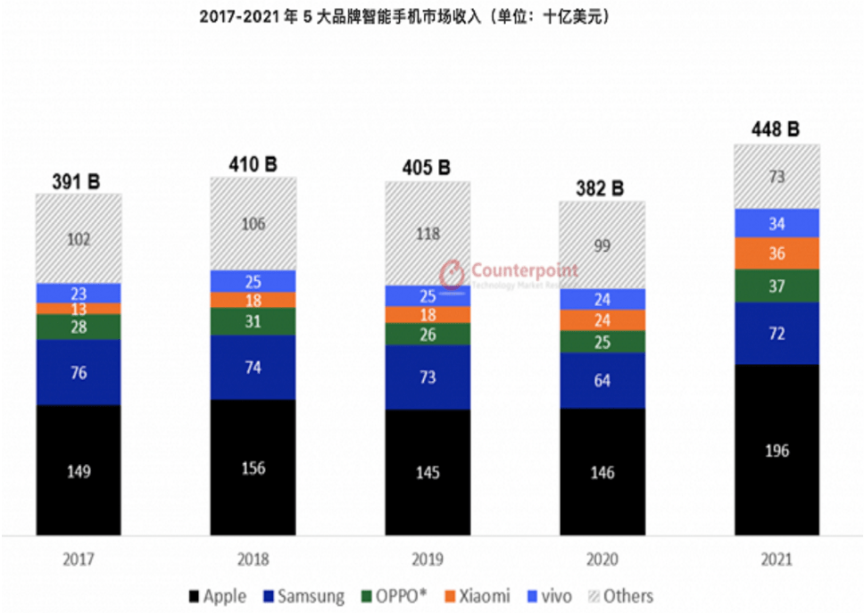 就vivo自身而言,2017-2020年其营收在240亿美元上下徘徊,几乎没有显著变化。进入2021年,受益于中高端手机需求增加,vivo营收实现了较快增长,但增速远不及苹果、小米,也略低于OPPO。