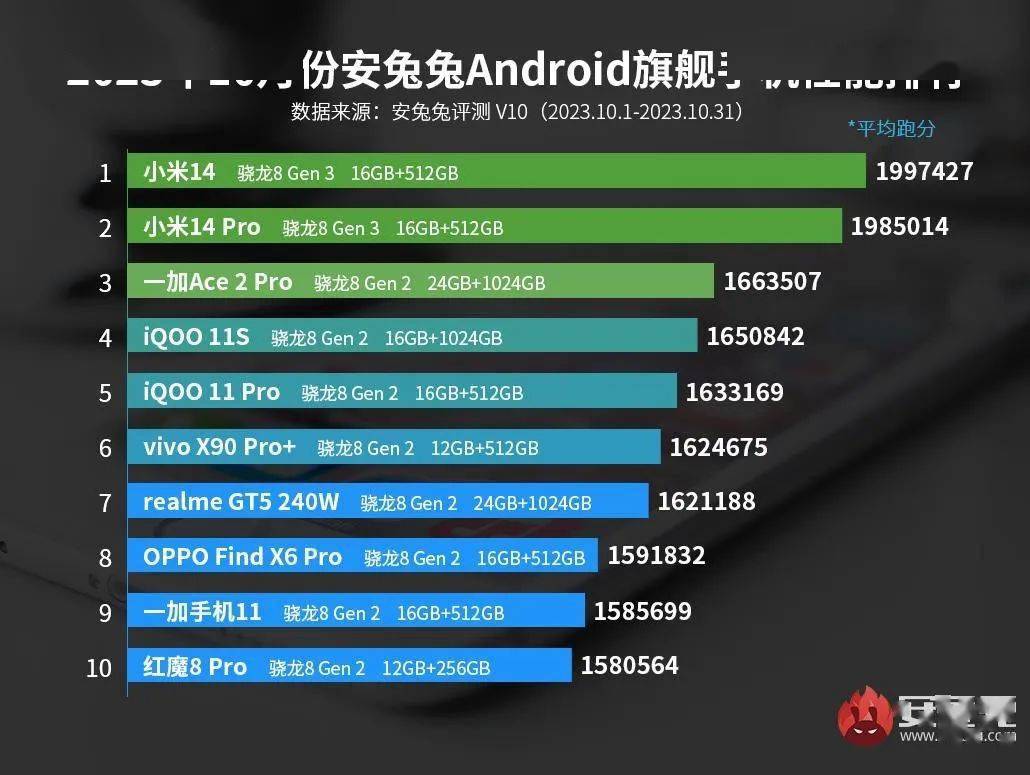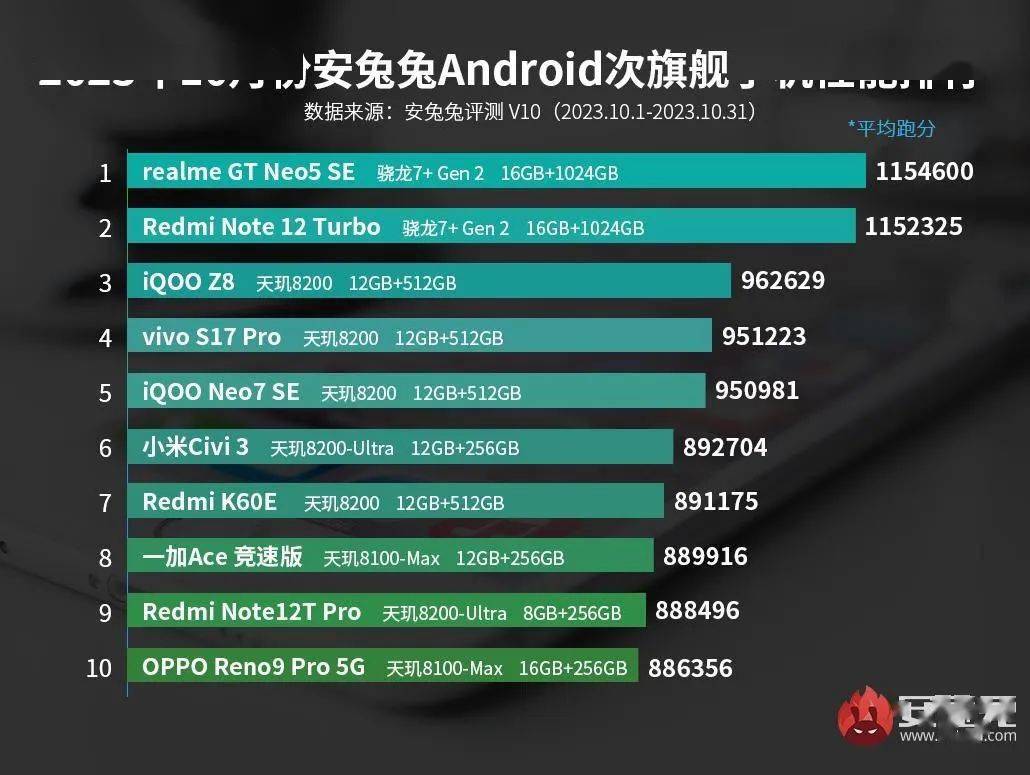 近日,安兔兔更新了2023年10月份Android中高端安卓手机性能榜单,来看看跑分具体排名~(数据统计的时间为2023年10月1日到10月31日,榜单内成绩为统计到机型当月平均成绩非最高跑分,只要有效跑分次数高于1000即参与榜单统计,数据均基于安兔兔V10版本计算。)