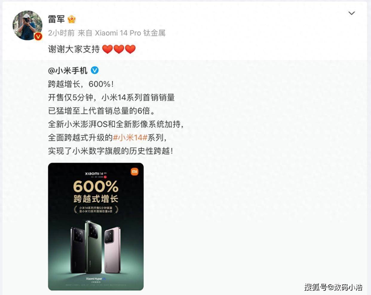 小米一直在对标iPhone手机,雷军自己也说了,“和强大的对手竞争,我们才能更进步。”而小米14系列销量全面压制iPhone15 Pro,可以看出现在的小米不再是在赶超iPhone,而是和iPhone并驾齐驱,同时,小米14系列首销也打破了平台近一年单品新机首销记录。