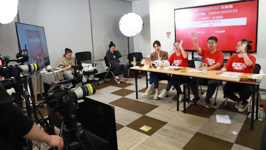 场地是用会议室临时改造的,除了基础的灯光、摄像设备,就是一台充当背景板的电视屏,以及两张简单拼在一起的写字桌。