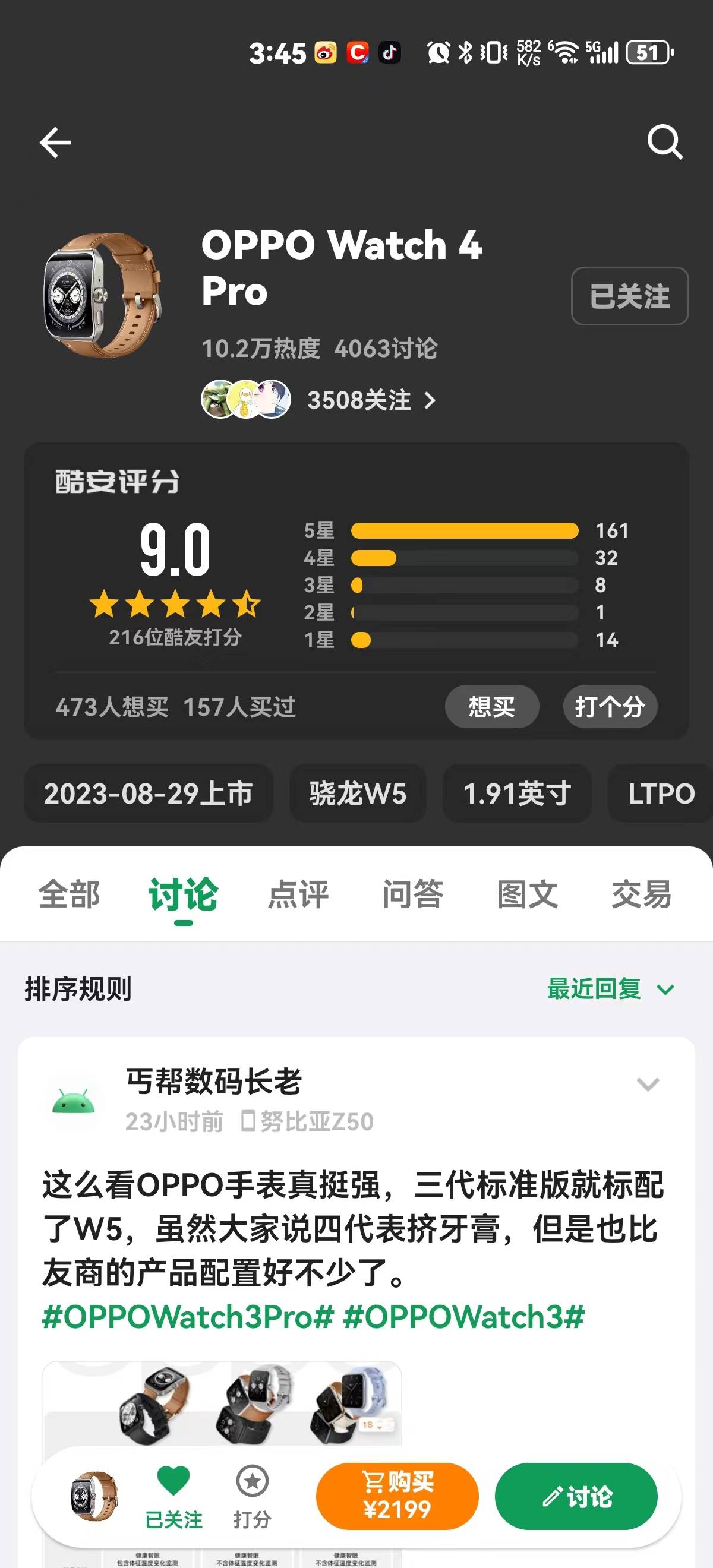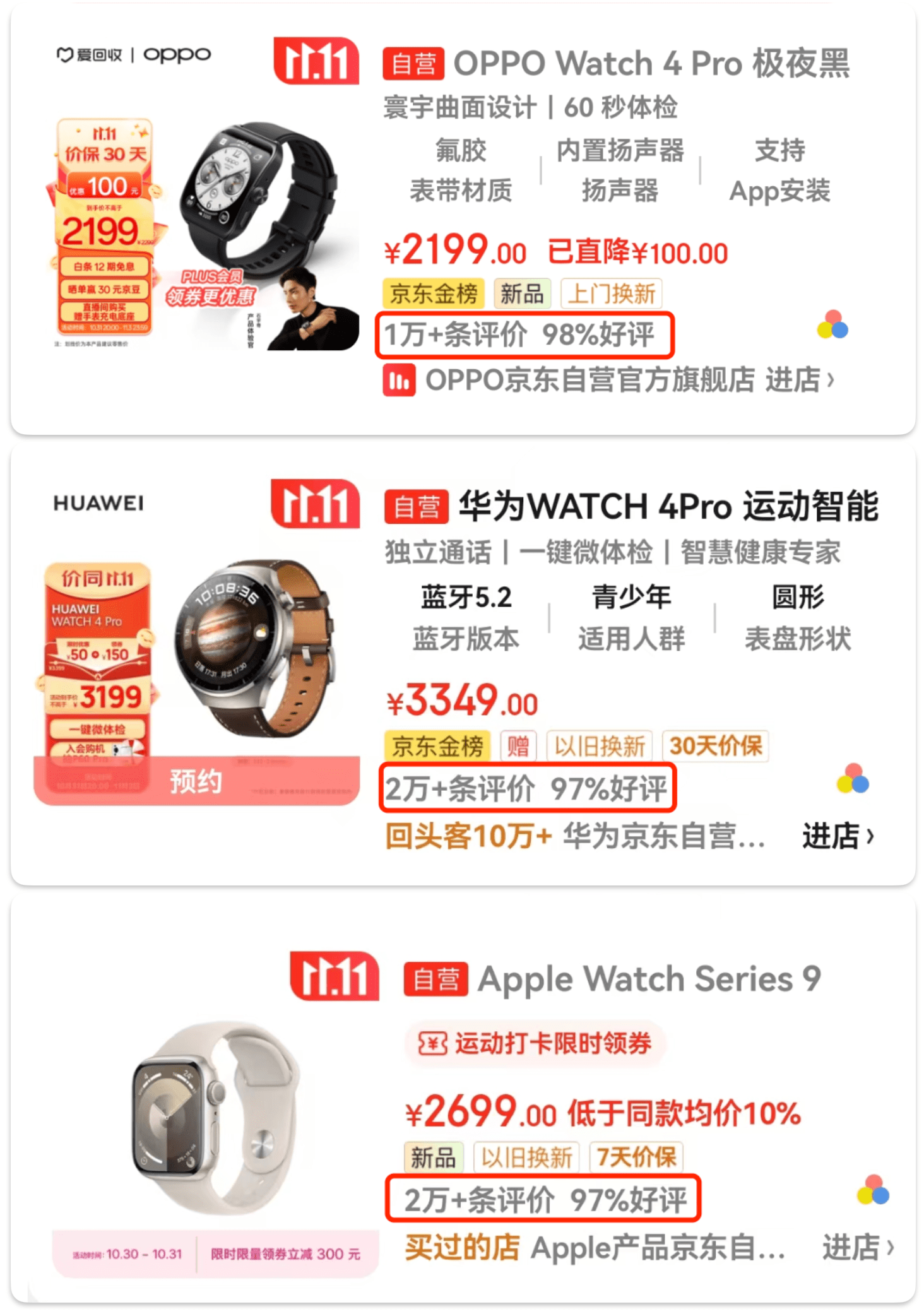 智能手表目前做得好的也就三家:苹果、华为、OPPO,其他手表无一都是个大号手环,就连最简单的APP安装功能都没有,何谈智能呢?并且这三家在某东上好评嘎嘎多,都在96%好评率以上,属于盲入不亏的,但一定要安利其中一款我会推荐OPPO Watch 4 Pro,其在酷安评分也高达9.0。