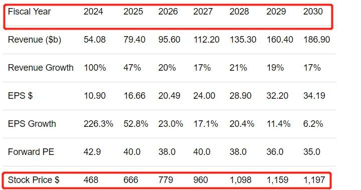 如果英伟达能够实现这一相对中性的目标预期,预计到2030年底每股收益将达到34.19美元。假设预期市盈率大幅收缩,并保持在远低于35x预期市盈率的历史平均水平,根据模型预测,预计英伟达股价在英伟达的2030财年将达到1197美元,这一预期似乎合乎情理。