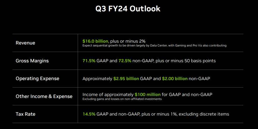 因此,考虑到以上这些因素,分析师们普遍预计英伟达强劲的业绩增长势头将在2024财年持续下去的原因非常明显。英伟达高管们预计第三季度营收将徘徊在160亿美元左右,较去年同期增长169%,这主要是受蓬勃发展的数据中心业务的推动。据此,推算出英伟达第三财季的每股收益约为2.95美元。
