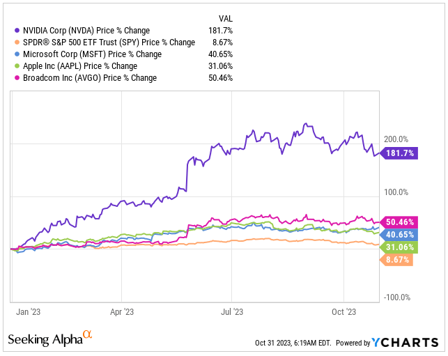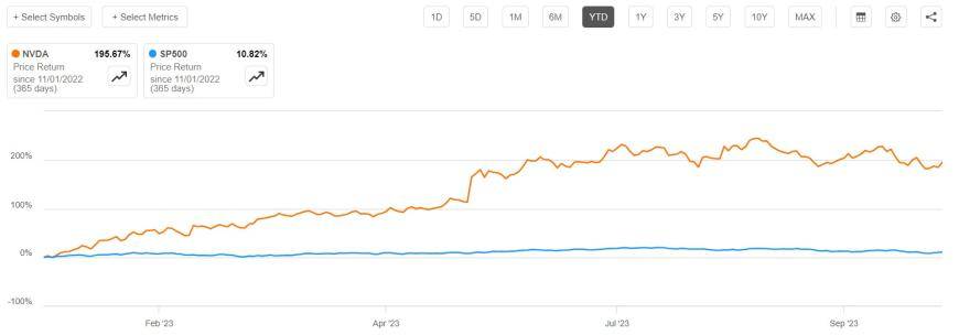 英伟达(NVDA.US)在2023年堪称是全球股票市场最火热的投资标的,得益于去年ChatGPT横空出世引发的人工智能投资狂潮,英伟达股价在2023年的表现异常出色。今年以来,英伟达股价涨幅达到了惊人的180%。这一成就不仅令该股轻松超过美股基准指数——标普500指数(S&P 500),同时也轻松超过了特斯拉、微软、苹果和谷歌等大型科技巨头,虽然上述科技巨头的表现也令人印象深刻,但与英伟达相比相差甚远。