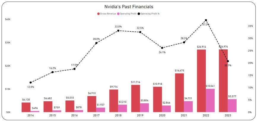 尽管利润率起伏不定,但英伟达在此期间的平均营业利润率仍保持在25.2%左右。然而,由于电子产品需求普遍下降,2023财年英伟达营业利润面临挑战。