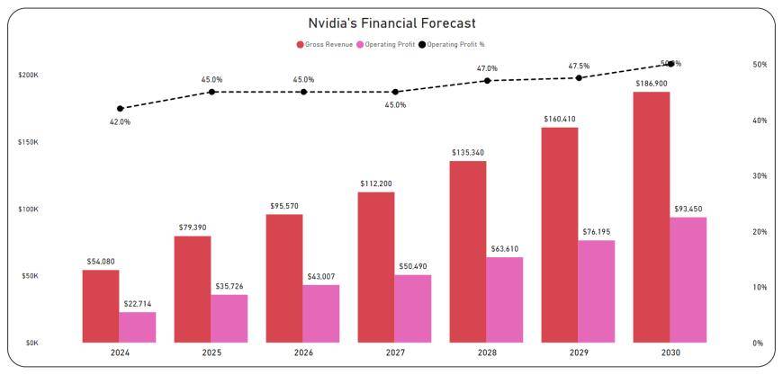 考虑到上述业绩趋势以及芯片出口管制等限制性因素,结合最新的分析师预期数据,从2024年到2030年英伟达的年化营收增速有望达到24.6%,营业利润在此期间的年化增速有望达到31.1%。
