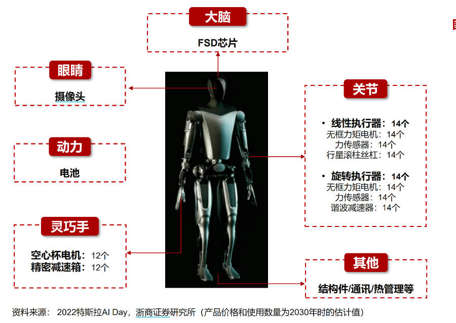 从产业链看来,关键环节目前仍依赖于国外厂商,但部分环节正在实施超越。以特斯拉Optimus为例,其核心部件包括空心杯电机、无框力矩电机、减速器、丝杠、力传感器等。