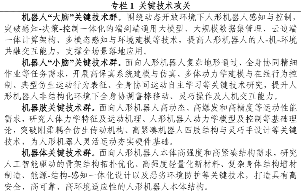 哪些技术事关人形机器人技术演进?《意见》给出了四个方面:机器人“大脑”关键技术群、“小脑”关键技术群、机器肢关键技术群和机器体关键技术群。