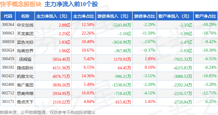 从资金流向上来看,当日快手概念股板块主力资金净流入7.1亿元,游资资金净流出4241.05万元,散户资金净流出6.67亿元。快手概念股板块个股资金流向见下表: