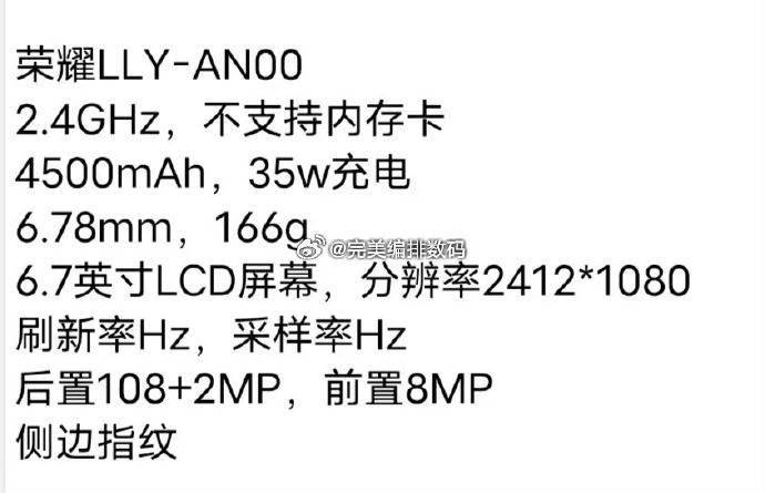 据博主 @完美编排数码 透露,这款新机代号为 LLY-AN00,搭载 2.4GHz 处理器(IT之家注:型号未知),不支持内存卡,机身内置 4500mAh 电池并支持 35W 充电,机身重量仅 166g。从电池选择和整体重量来看,该机预计将主打轻薄。