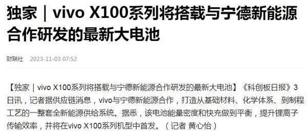 【手机中国新闻】11月3日,《科创板日报》独家报道,vivo与宁德新能源达成合作,共同打造一套全新的能源供给系统,涵盖基础材料、化学体系和制程工艺。据悉,这款电池在能量密度和快充方面取得了平衡,提高了锂离子传输效率,并将在vivo X100系列手机中首次亮相。