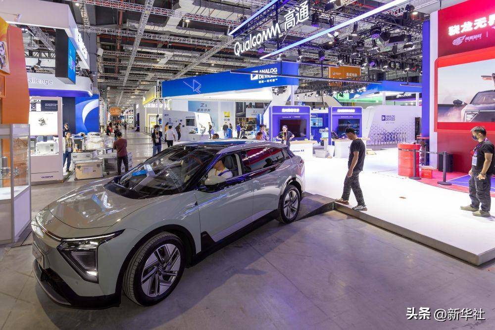 ↑11月2日,一辆搭载高通芯片的智能电动汽车准备驶向高通展位。新华社记者王翔摄