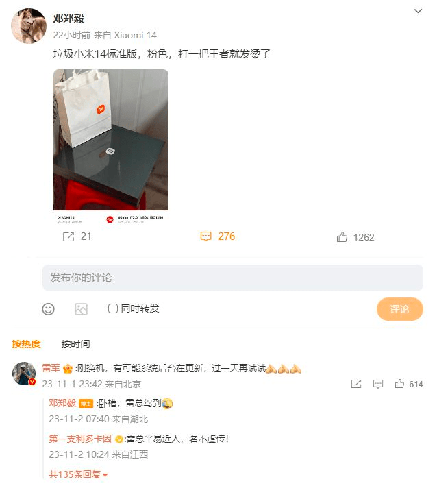 网友曝小米 14 发烫,雷军亲自回应:可能系统后台在更新