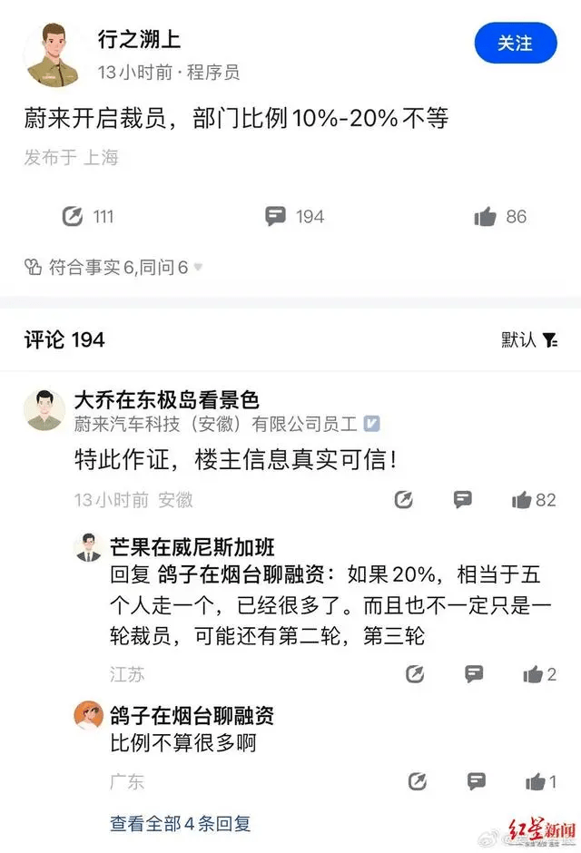 不过 11 月 2 日下午,该爆料原帖被删除。蔚来方面向红星资本局表示,没有收到相关信息。多位蔚来一线销售、市场人员也表示,目前没有听说过裁员的消息。