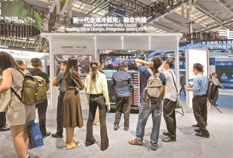 6月29日,使用“全液冷”技术的超充设备在2023国际数字能源展上展出,吸引观众驻足观看。 深圳晚报记者 严文婷 摄