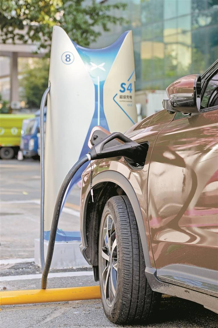 新能源汽车在南山区南油文化广场超充电站停车充电。 深圳晚报记者 严文婷 摄