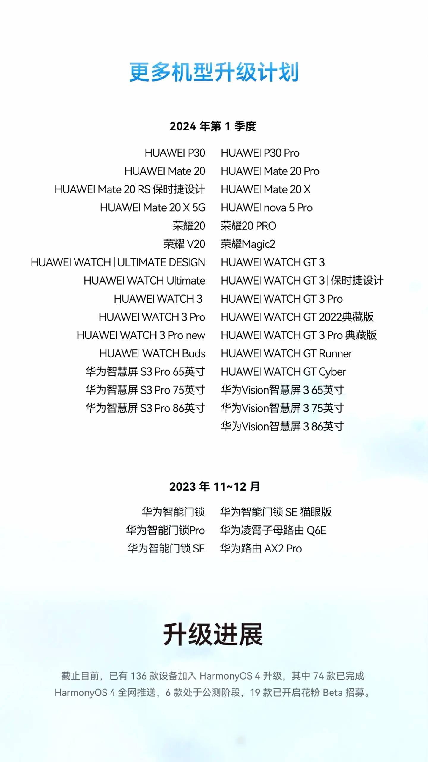 截至目前,已有 136 款设备加入 HarmonyOS 4 升级,其中 74 款已完成 HarmonyOS 4 全网推送,6 款处于公测阶段,19 款已开后花粉 Beta 招募。