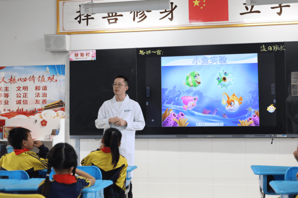随后,刘初又通过小鱼实验向学生们展示了液氮如何运用在医学中。他将带来的小金鱼用勺子放进液氮几秒后,小金鱼周边也变白了,并且不动了。随后又将小金鱼放入鱼缸中,没多久小金鱼又活了过来。他说:“将小金鱼放进液氮中它会进入休眠,而中国这个技术在世界遥遥领先。中国曾进行过将13个人放入液氮中的实验。”他告诉学生,中国的科技已经很强大,对于疾病的治疗手段也不断提高。