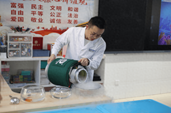 从氮气罐中倒了一些液氮,将玫瑰花放入盛满液氮的盆里5秒,拿出玫瑰花发现它外面变白,轻轻一捏,玫瑰花便被捏碎了。11月2日,合肥一六八玫瑰园学校东校区“家长进课堂”活动在该校二(3)班开讲。本次活动由学生家长、来自瑞新生物的刘初主讲,主题是“神奇的生命科学”。
