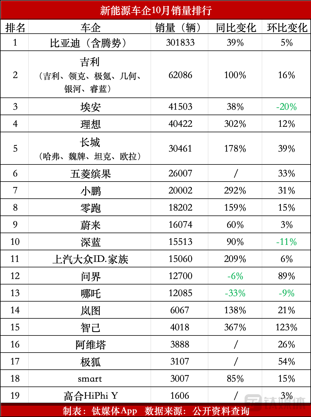 总体来看,10月的新能源车企迎来了难得的狂飙时刻。钛媒体App统计的19家车企中,有13家月交付创下了历史新高,这样的时刻可谓前有未见。
