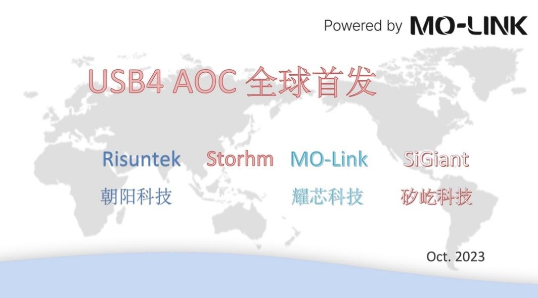 2023年10月31日,广东朝阳电子科技联合北美品牌Storhm、以及杭州耀芯科技、上海矽屹科技在深圳共同举办了USB4 AOC全球首发发布会,通过全新的“OIP”技术,为用户带来了低成本、无损耗、全带宽和长距离的USB4 AOC数据/视频信号传输解决方案。