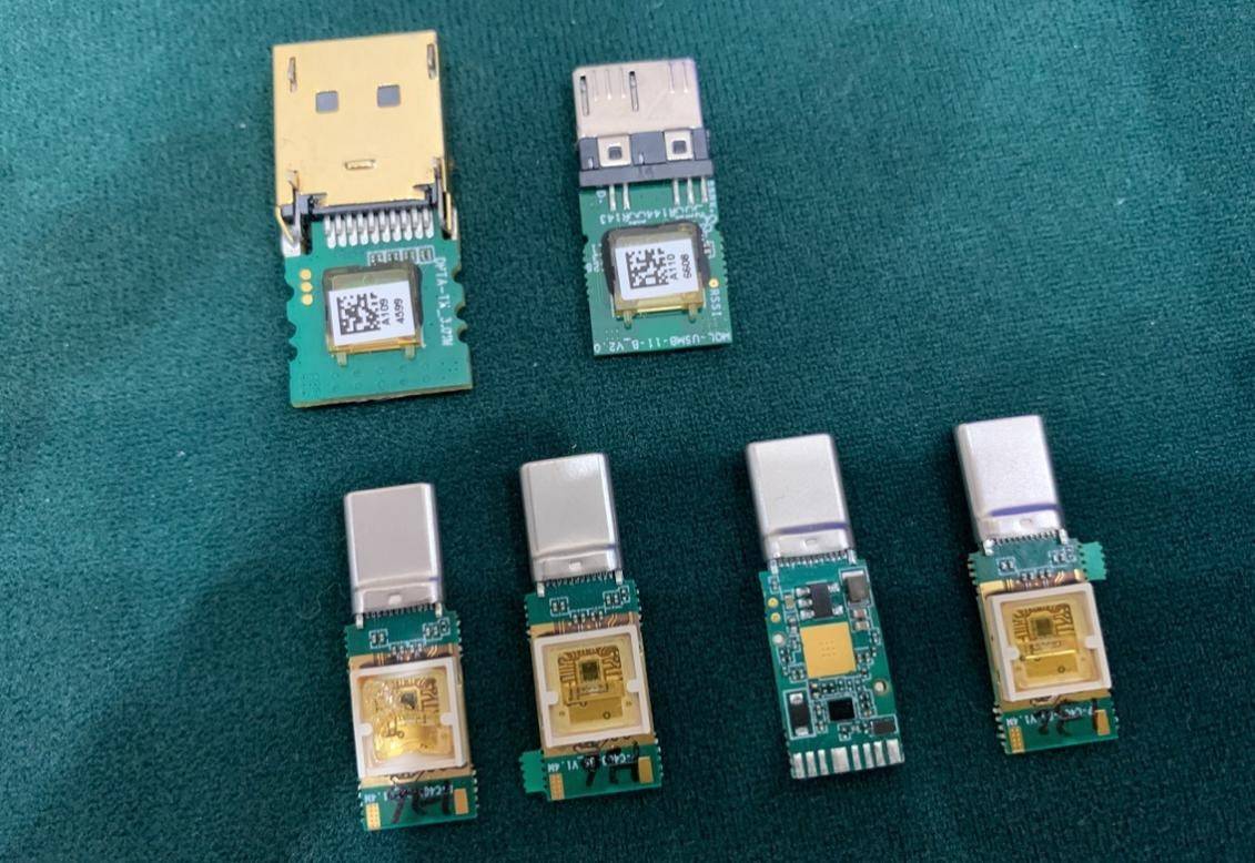 USB4 AOC采用光电复合模组,从结构看分为光路和电路两部分,两端的光收发器件,用于负责USB4和Display Port 2.1高速协议,而电路部分负责USB2.0、光路系统供电和各类快充协议。它的核心部件为耀芯科技专利的OIP(Optical In Package),将多个不同功能的芯片(包括但不限于光芯片、电芯片和光学器件)集成于一个封装中(类似智能手机的SIP),从而实现完整的功能。在现场耀芯科技展示了基于OIP的各种AOC互联互通解决方案,包括USB4 Type-C、HDMI、Display Port和USB Micro-B等,未来更多的新产品都是采用这个工艺发展。