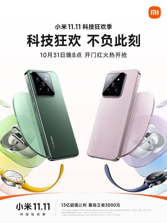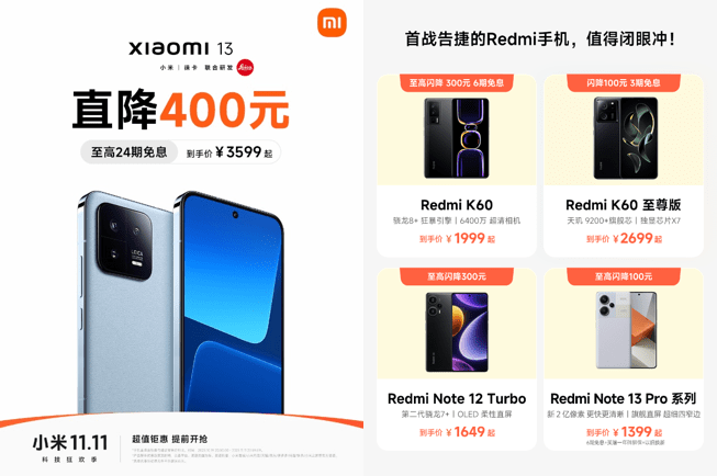 小米于10月23日晚8点正式拉开双11大促。在本次“小米11.11 科技狂欢季”中,小米携13亿超值补贴钜惠入场,全场数百款科技产品特惠直降,最高可立省3000元。包括小米13、Redmi K60、Redmi Note 12 Turbo在内的众多爆款机型直接现货开卖。此外,还有小米电视、冰箱、洗衣机、净水器等众多产品特惠开卖,涵盖智能家居、智能穿戴、健康生活等各种品类,消费者可以闭着眼睛买款款好物。