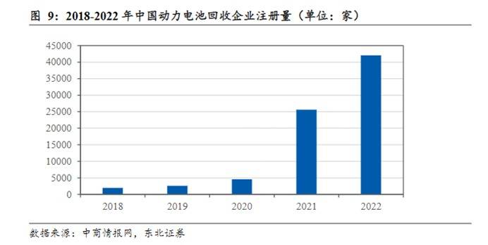 数据显示,2018年动力电池回收相关企业注册量2160余家,2020年新增动力电池回收企业4500家,2021年动力电池回收企业注册量暴增至2.22万家,2022年动力电池回收企业注册量达3.8万家,这导致我国在业或存续动力电池回收企业达到7.8万余家。
