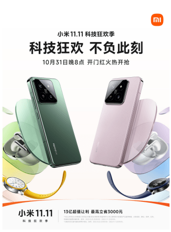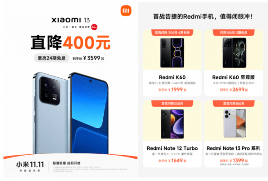 小米于10月23日晚8点正式拉开双11大促。在本次“小米11.11 科技狂欢季”中,小米携13亿超值补贴钜惠入场,全场数百款科技产品特惠直降,最高可立省3000元。包括小米13、Redmi K60、Redmi Note 12 Turbo在内的众多爆款机型直接现货开卖。此外,还有小米电视、冰箱、洗衣机、净水器等众多产品特惠开卖,涵盖智能家居、智能穿戴、健康生活等各种品类,消费者可以闭着眼睛买款款好物。