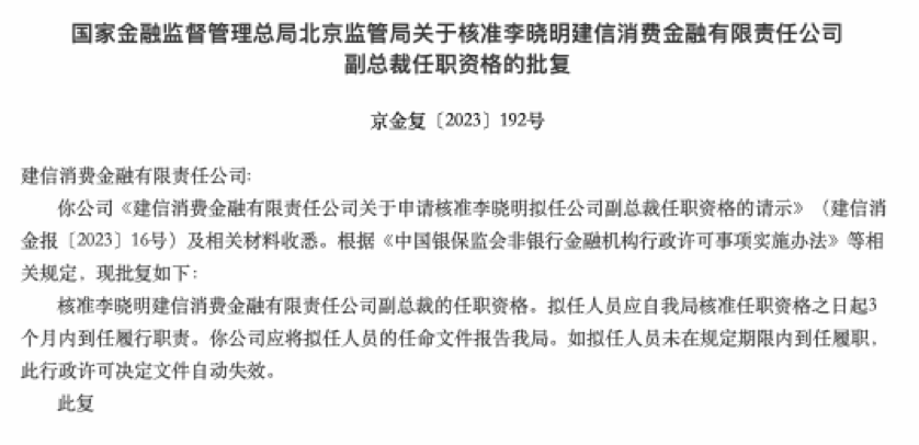 建信消费金融副总裁李晓明任职资格获批