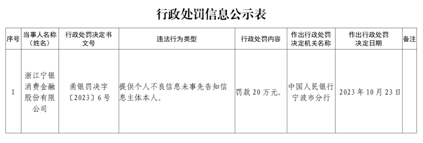 10月27日,中国人民银行宁波市分行发布的行政处罚信息公示表显示,宁银消费金融因“提供个人不良信息未事先告知信息主体本人”被罚款20万元。
