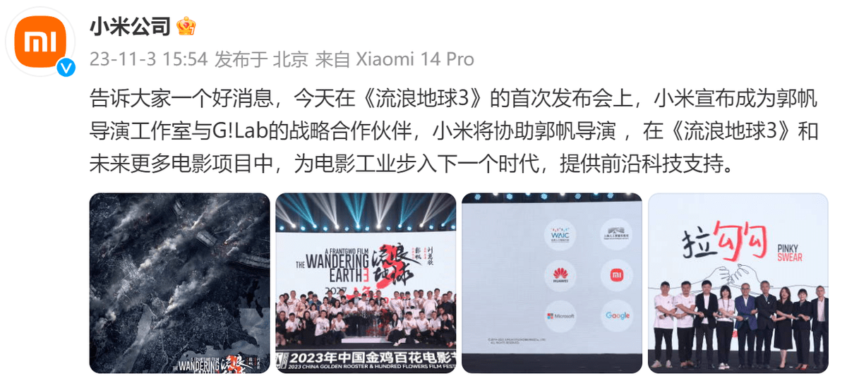 刚刚在《流浪地球3》的首次发布会上,小米集团正式宣布与郭帆导演工作室以及G!Lab达成战略合作,小米将为《流浪地球3》以及未来更多的电影项目提供前沿科技支持,推动电影工业的进一步发展。
