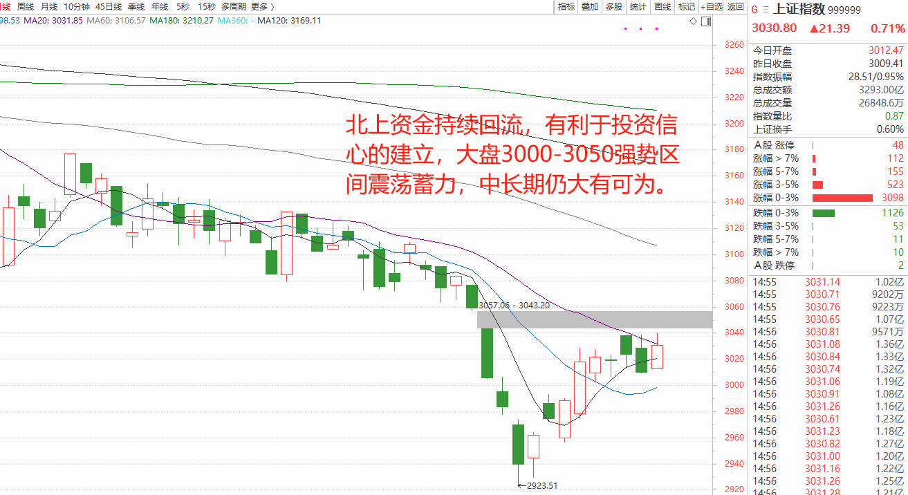 北上资金持续回流,有利于投资信心的建立,大盘3000-3050强势区间震荡蓄力,中长期仍大有可为。