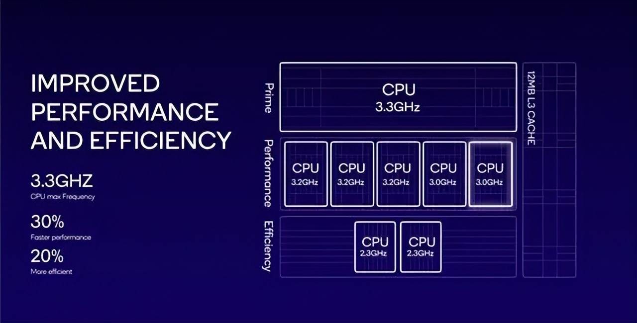 即1颗超大性能核心,5核大性能核心和2颗小能效核心。具体为:1颗3.3GHz 主频Arm Cortex-X4 超大核心、5颗最高主频3.2GHz大核心、以及2颗 2.3GHz 主频能效核心。