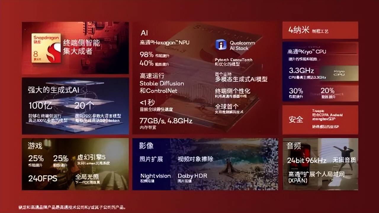 除此之外,骁龙 8 Gen 3还在AI和5G技术方面取得了重大突破。比如,在AI方面,骁龙 8 Gen 3搭载了业内领先的NPU,充分发挥AI技术,极大地丰富了高端智能手机在内容创作、摄影、游戏、音频处理和网络连接等方面的体验。