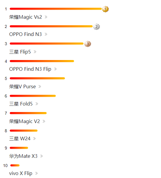 此外,在京东手机竞速榜折叠屏品类榜单中,荣耀同样有三款机型上榜,它们分别是荣耀Magic Vs2、荣耀V Purse和荣耀Magic V2。其中,荣耀Magic Vs2也已经连续七天霸榜前三。