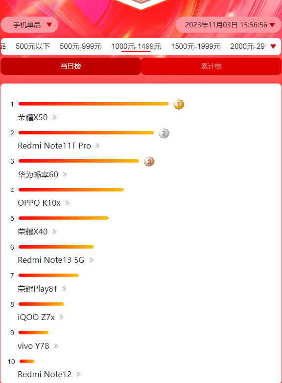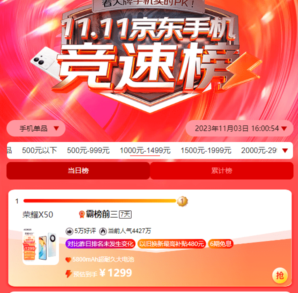 【手机中国新闻】目前,双十一大促正火热进行中,与往年一样,手机依旧是消费者关注度最高的品类之一。11月3日下午4点,手机中国注意到,荣耀有三款机型进入京东手机竞速榜1000元-1499元品类榜单前十。这三款机型分别是荣耀X50、荣耀X40和荣耀Play8T,其中,荣耀X50已经连续七天霸榜前三,人气可以说是遥遥领先。