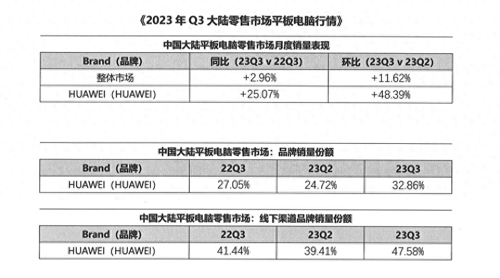 根据国际市场研究公司捷孚凯(GfK)公布的最新数据,2023年第三季度中国大陆平板电脑零售市场销量同比增长 2.96%,其中,华为平板市场表现最为突出,市场份额高达 32.86%,销量同比增长 25.07%,或将登顶中国平板电脑销量第一。在线下渠道,华为平板更是占据了半壁江山。