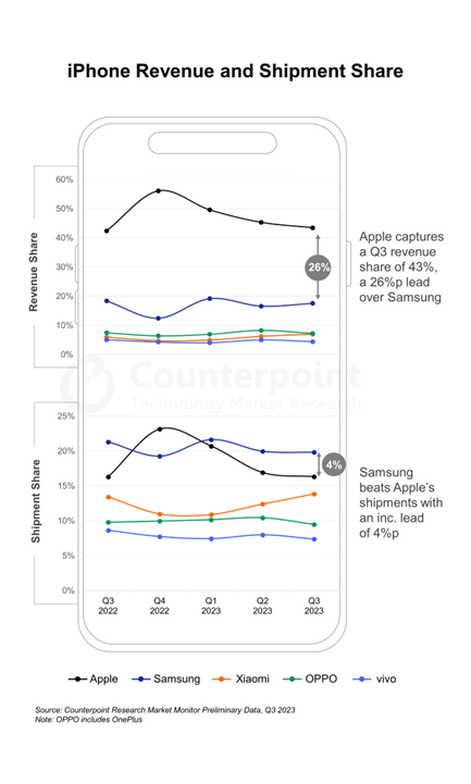 在全球智能手机收入占比中,虽然苹果 iPhone 15 系列上市时间比去年同期少了 1 周时间,但苹果公司以 43% 领跑,刷新了有史以来第 3 季度最高份额。