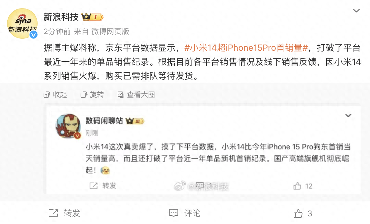 对于国产手机行业来说,2023年应该是载入史册的时刻,华为和小米两个品牌先后创造奇迹,打破苹果在业内不可战胜的神话。随着华为Mate60系列、小米14系列不断打破销量纪录,iPhone 15Pro系列降价保销量,网友为国产的崛起点赞。