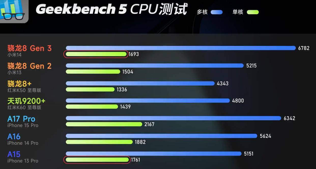 在核心处理器上,小米14系列采用了新一代的骁龙8 Gen3处理器,骁龙这次性能和功耗都得表现都超过了苹果15搭载的A17 Pro,大大提高了用户的使用体验。在处理器排行榜单上,8Gen3也正式成为手机处理器排第一的芯片。