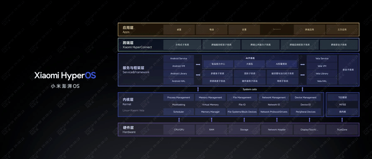在最底层的系统内核层,研发团队将自研Mina OS和Vela OS的内核与深度修改的Linux系统内核进行融合,重构了性能调度、任务管理、内存管理、文件管理等各个基础模块,实现了性能、效率的大幅提升。
